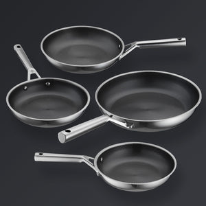 Four pans. Infinite possibilities. Crafted from 30D Stainless Steel with Hybrid Nonstick Technology, this PTFE-Free set delivers flawless performance across every size — from quick meals to family feasts.