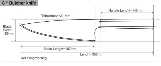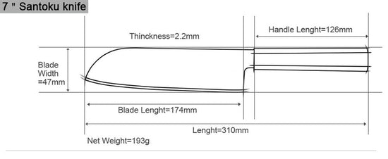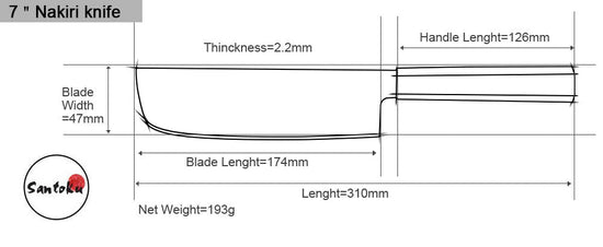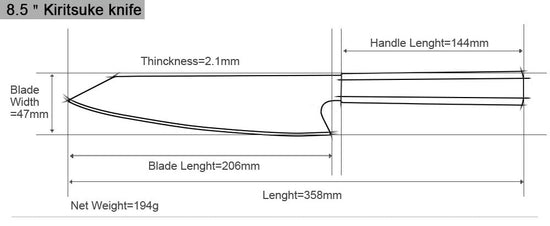 - 8.5-inch Chef, 8-inch Butcher, 8-inch Kiritsuke, 7-inch Santoku, and 7-inch Nakiri options.