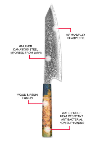 - Chef de 8.5 pulgadas, carnicero de 8 pulgadas, kiritsuke de 8 pulgadas, santoku de 7 pulgadas y opciones Nakiri de 7 pulgadas.